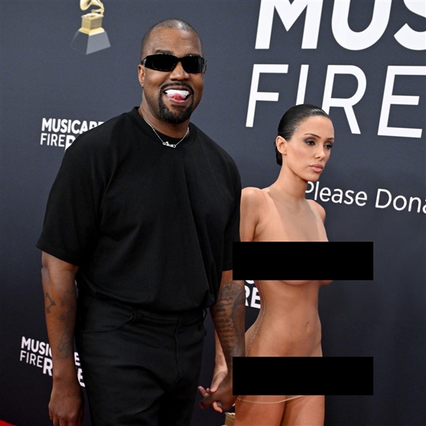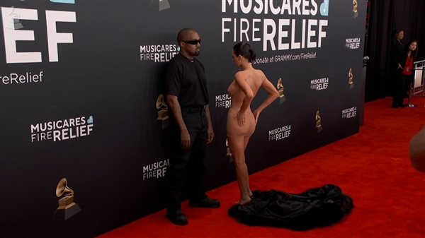 唯一的例外是Kanye West带着老婆Bianca重返格莱美,后者在众多摄影师的鼓噪声中徐徐卸下皮草,展现近乎全裸造型: