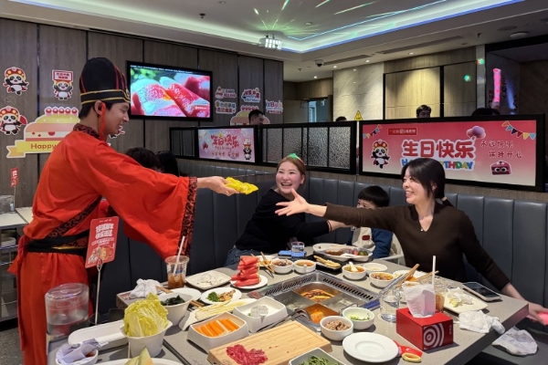 海底捞火锅上海人民广场店的店经理胡小征介绍, “从除夕、初一、初二这几天数据来看,门店平均接待外籍游客大概200人次左右,占总接待人次约15%,比去年增长3-5个百分点左右。” 此外,门店还特意增加了免费冰淇淋的供应,同时在小料台新增了春节特色水果-砂糖橘,“外籍游客也很喜欢吃。”