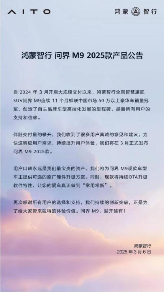 日前,2025款问界M9正式亮相并发布预售,携新十大黑科技强势而来。值得关注的是,在宣布新款车型信息的同时,问界还贴心地为现有20万老用户推出了可选的原厂硬件升级方案,并承诺将持续进行OTA软件特性升级,确保每一辆问界座驾都能与时俱进,实现“常用常新”的体验。在这个常被调侃为“割韭菜”的时代背景下,问界此举在用户群体及市场中赢得了广泛赞誉。